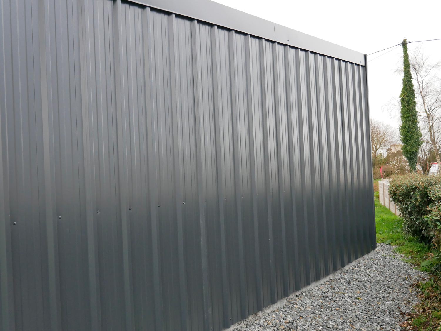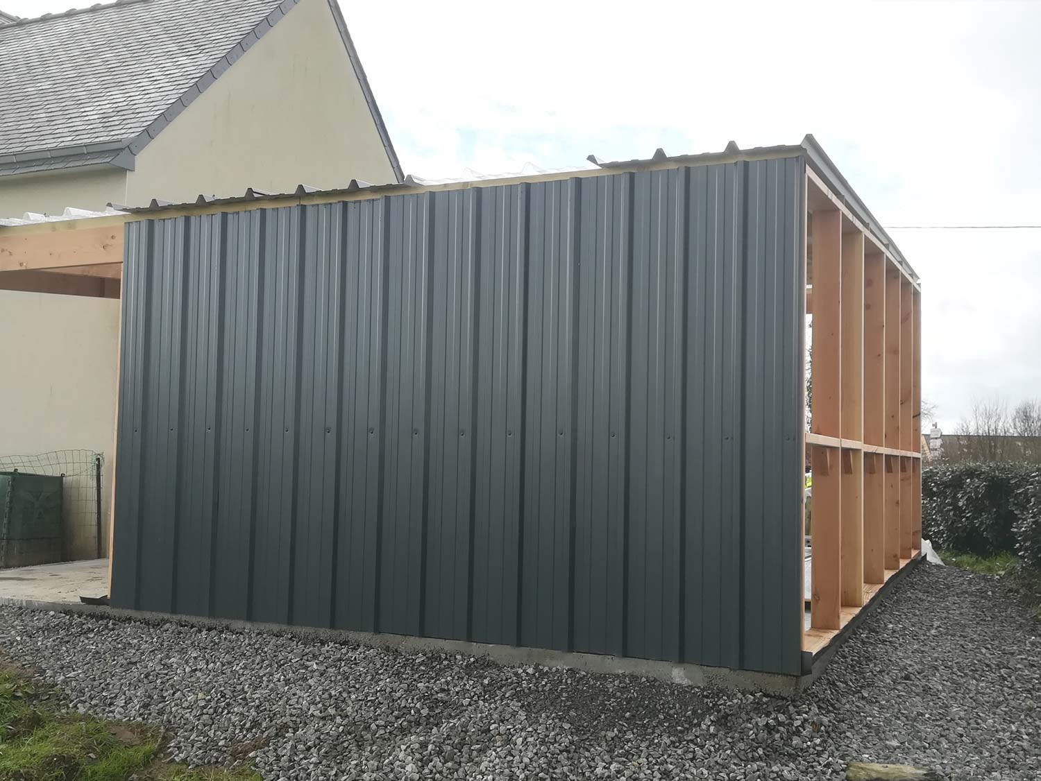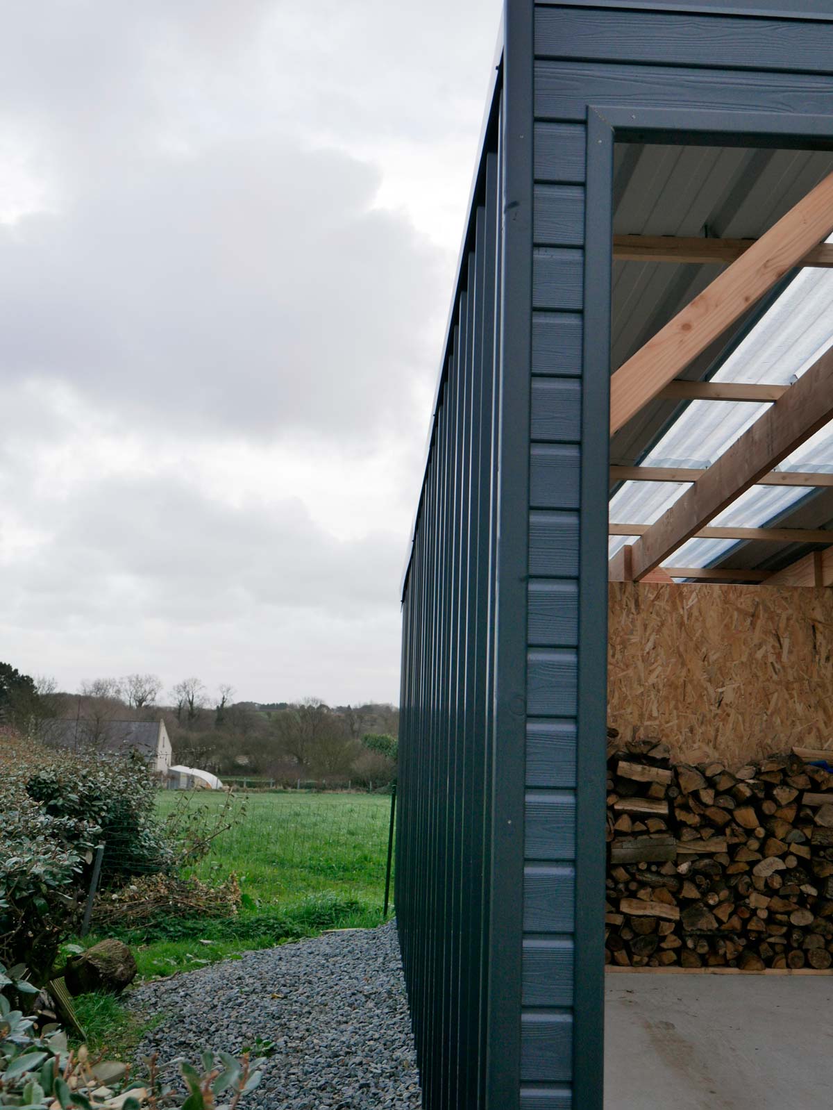 Façade en bardage bois peint couleur anthracite, pignon et couverture en tôle avec translucides laissant passer la lumière.