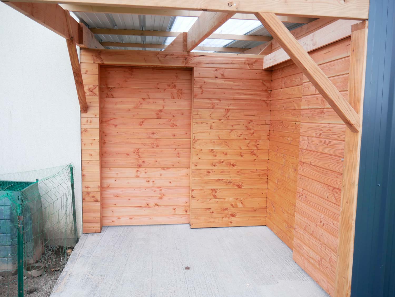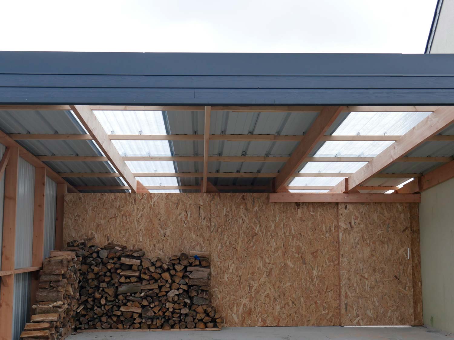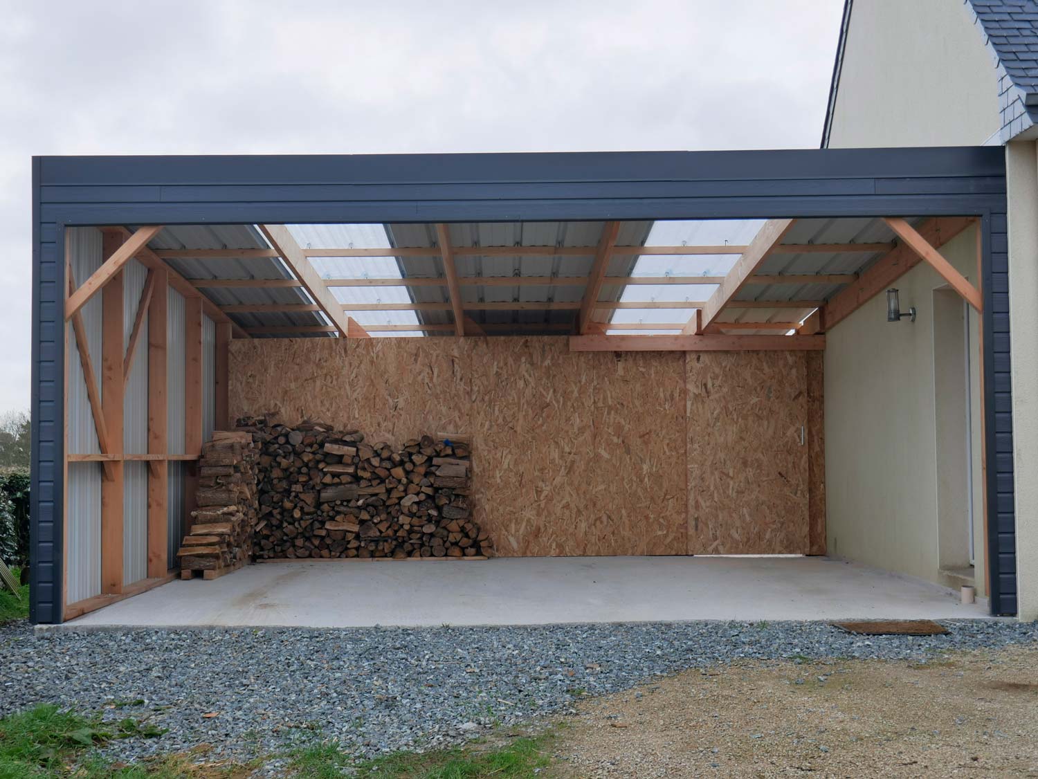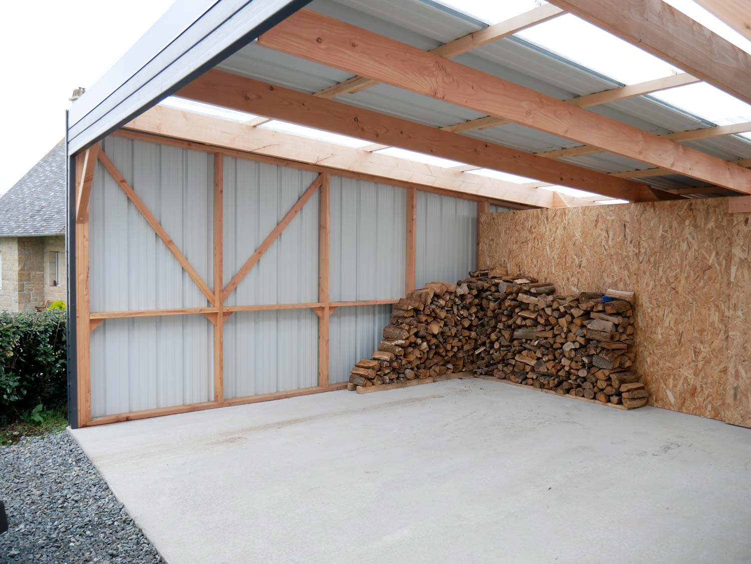 Grand carport de 45 m2 réalisé avec une charpente en bois douglas, accolé à la maison.