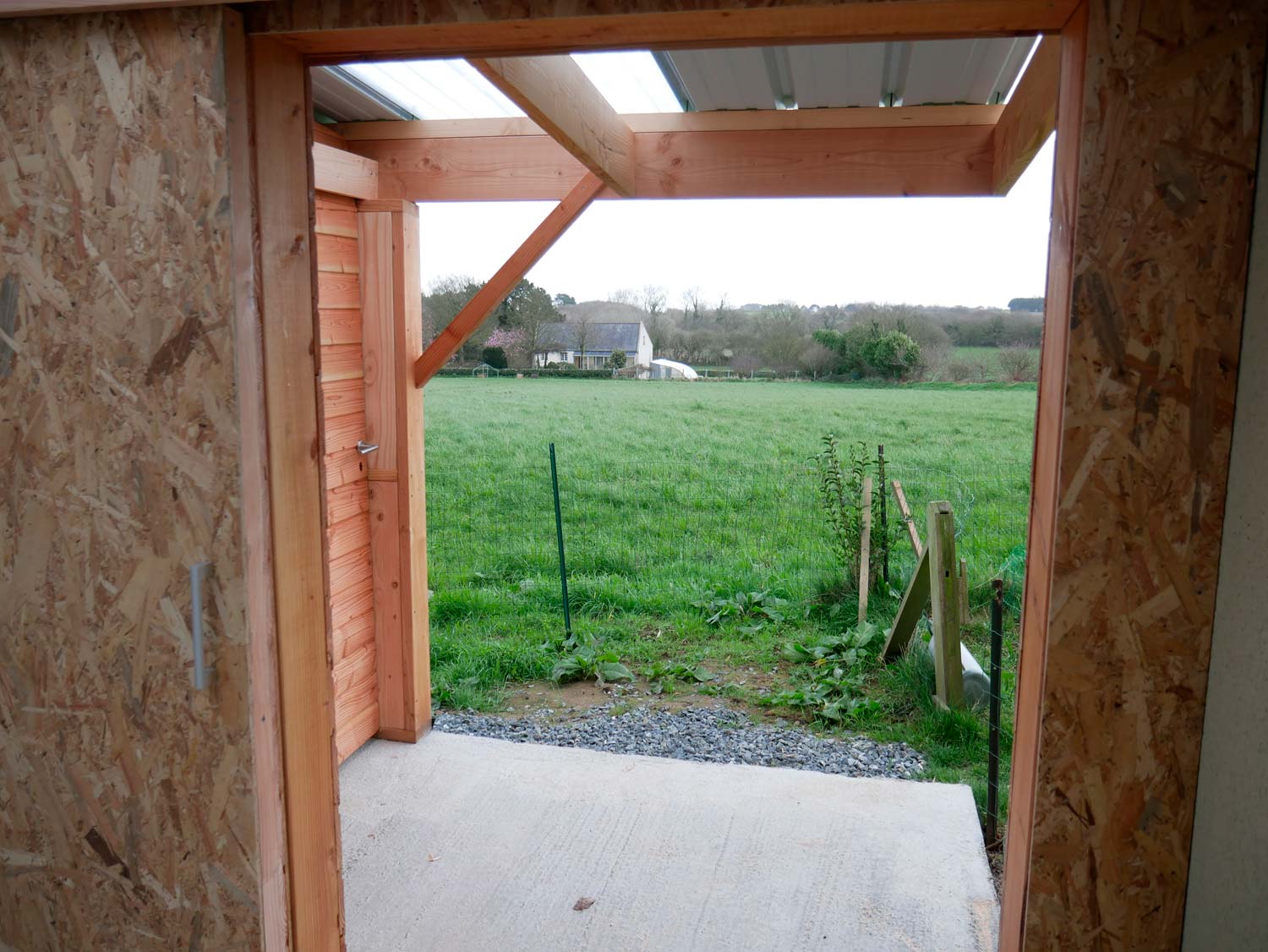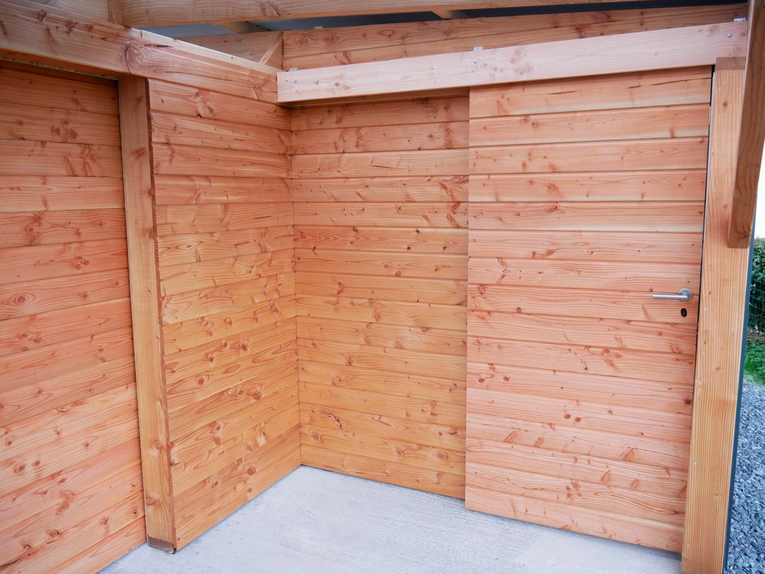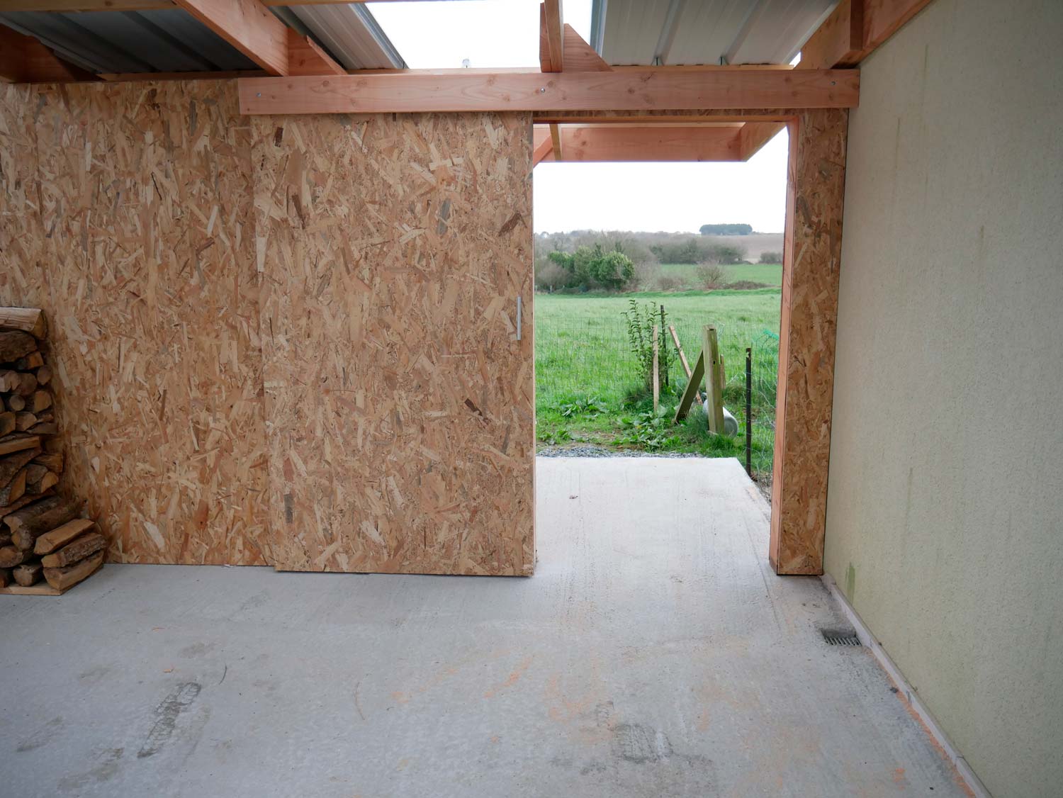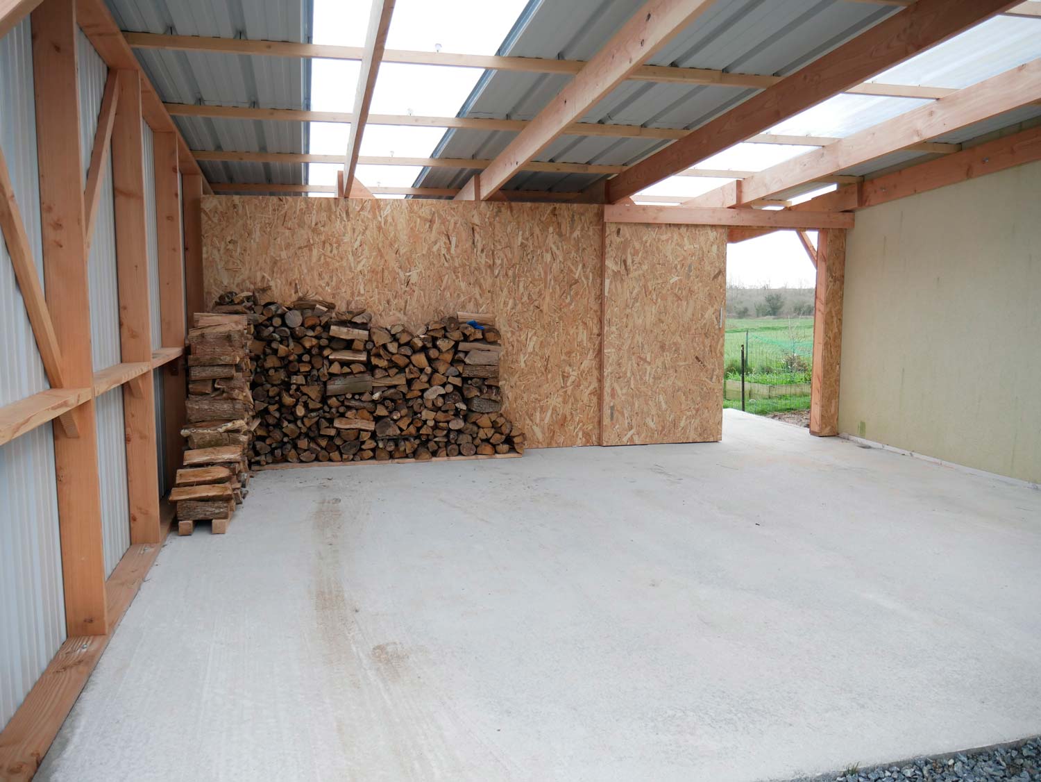 Grand carport de 45 m2 réalisé avec une charpente en bois douglas, accolé à la maison.