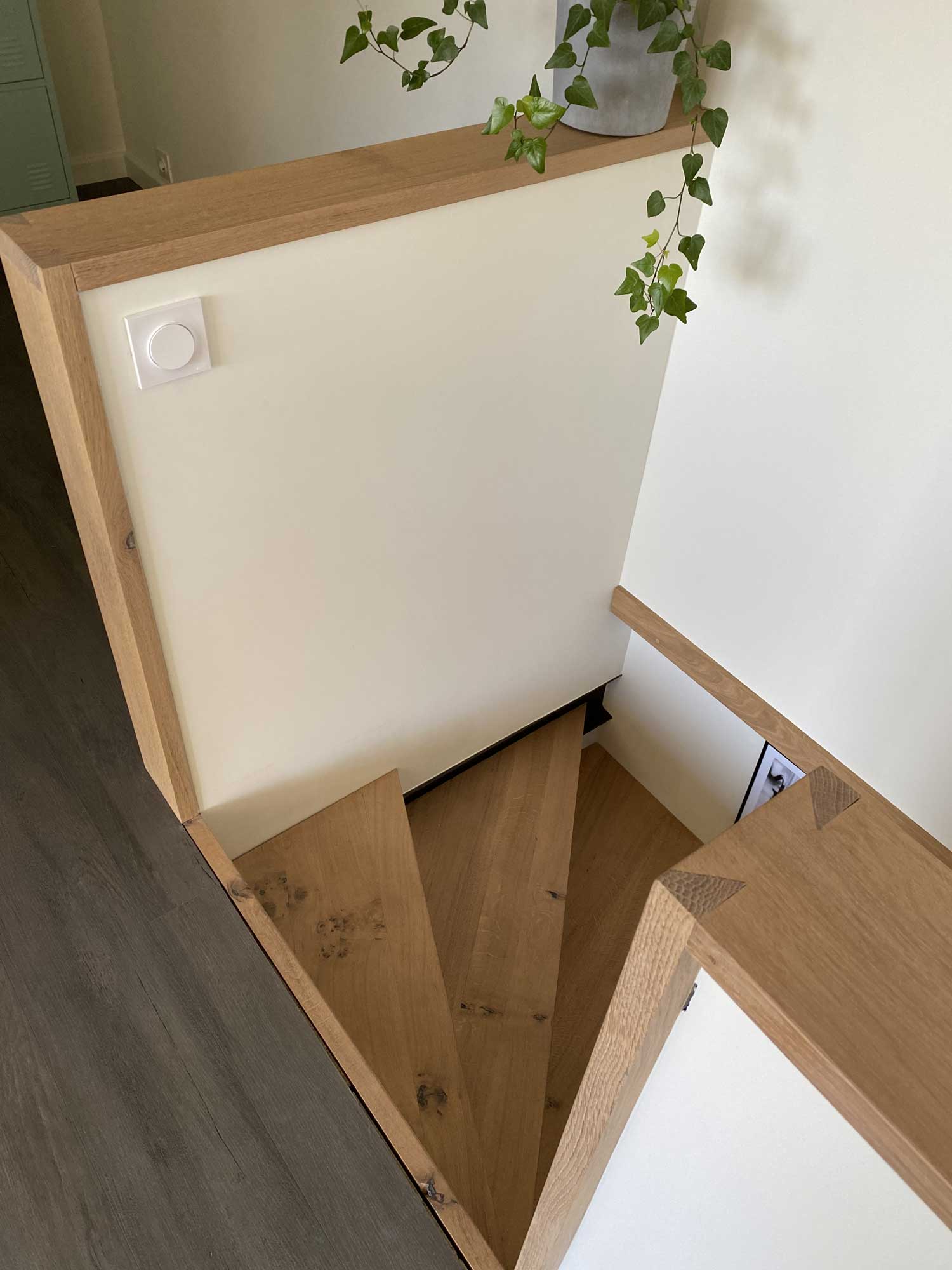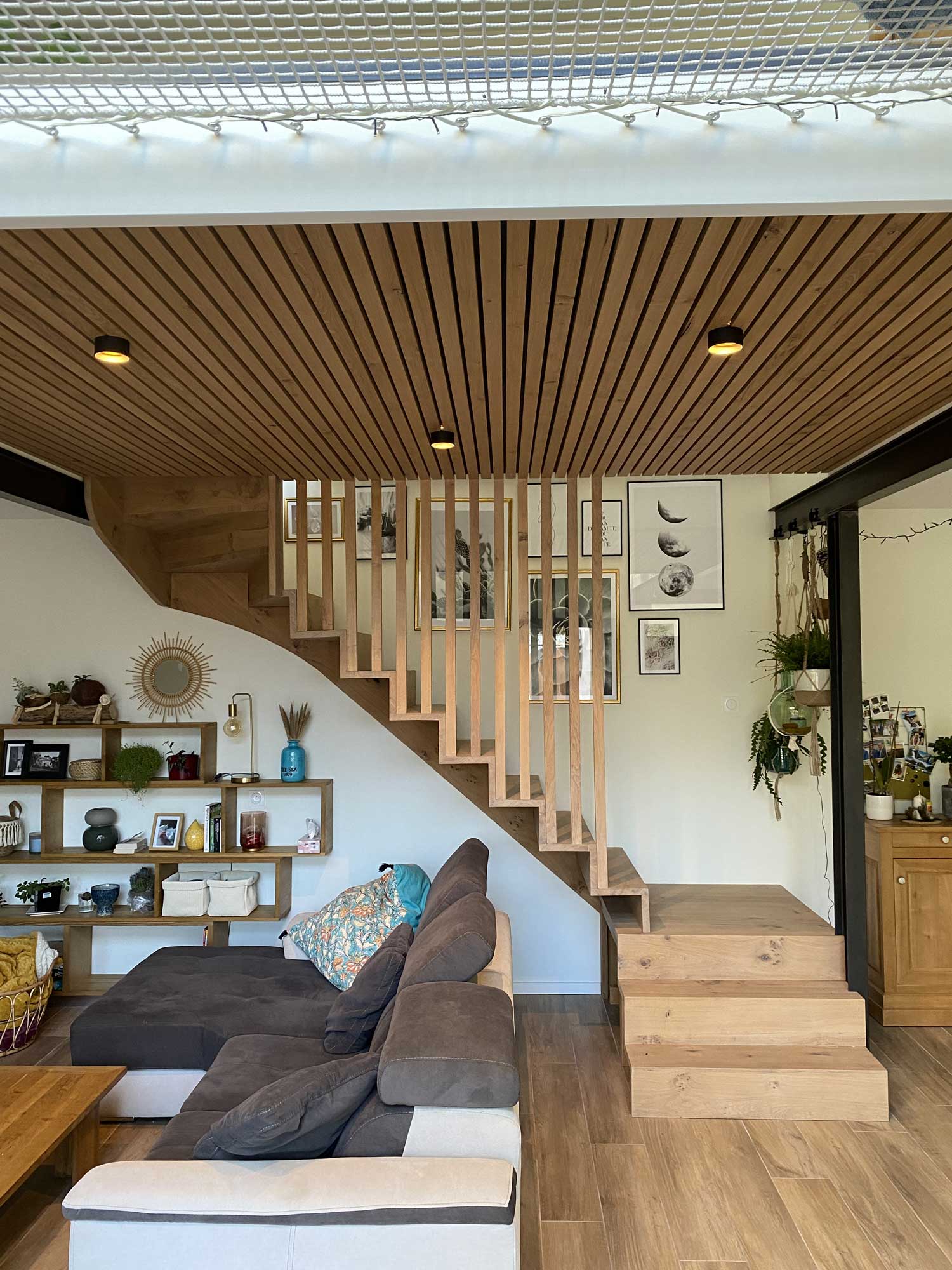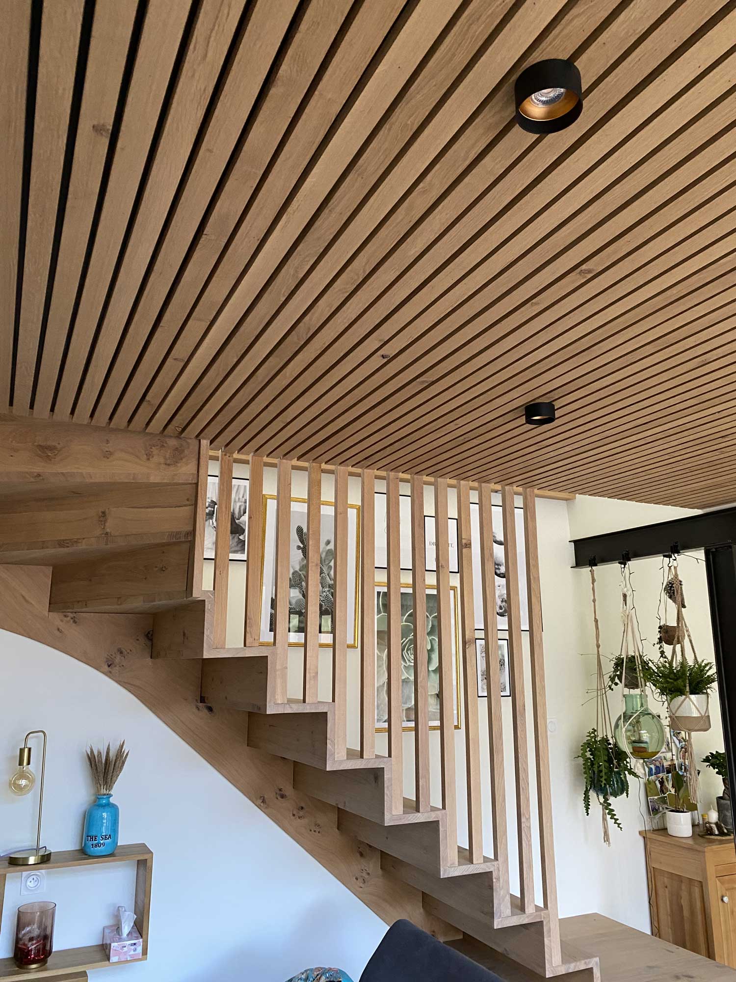 Fabrication et pose d’un escalier et d’un lambris en chêne noueux dans maison neuve.