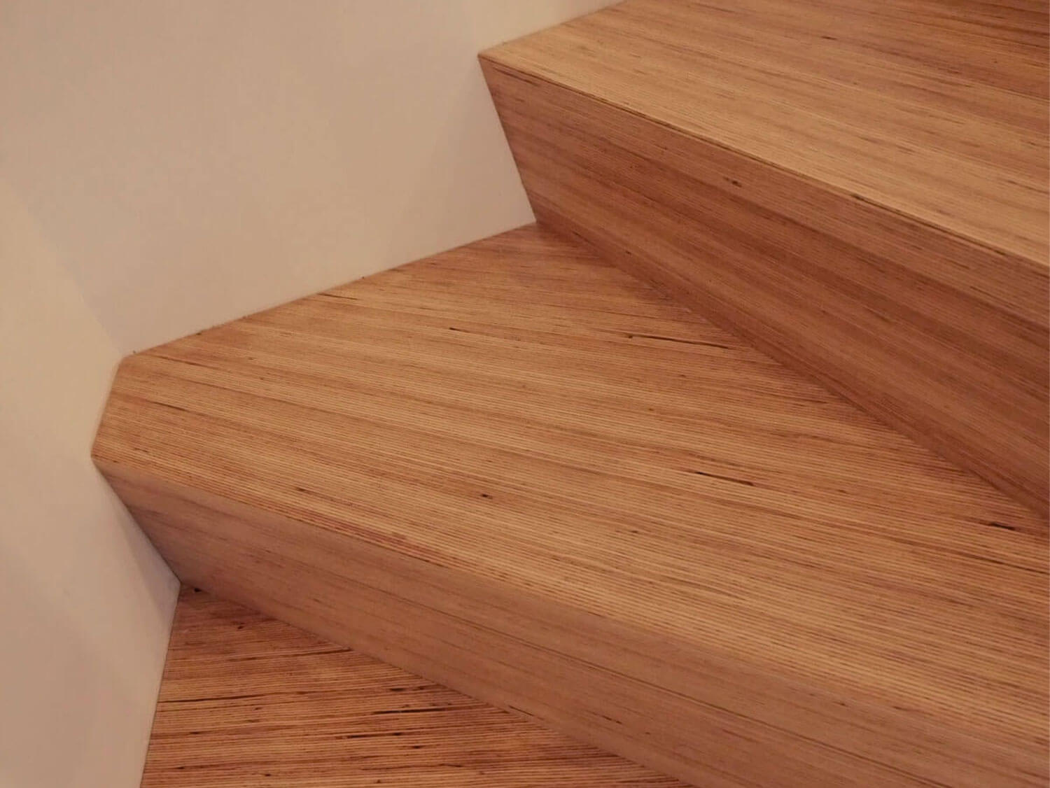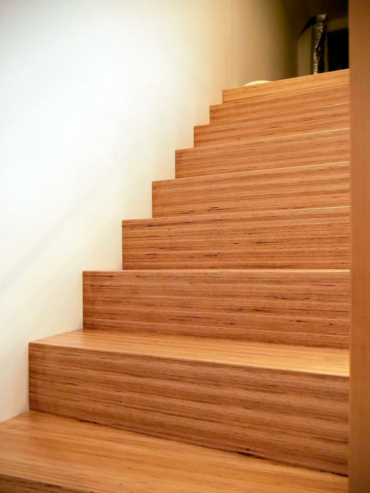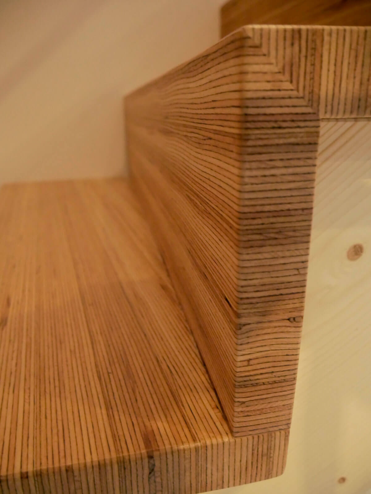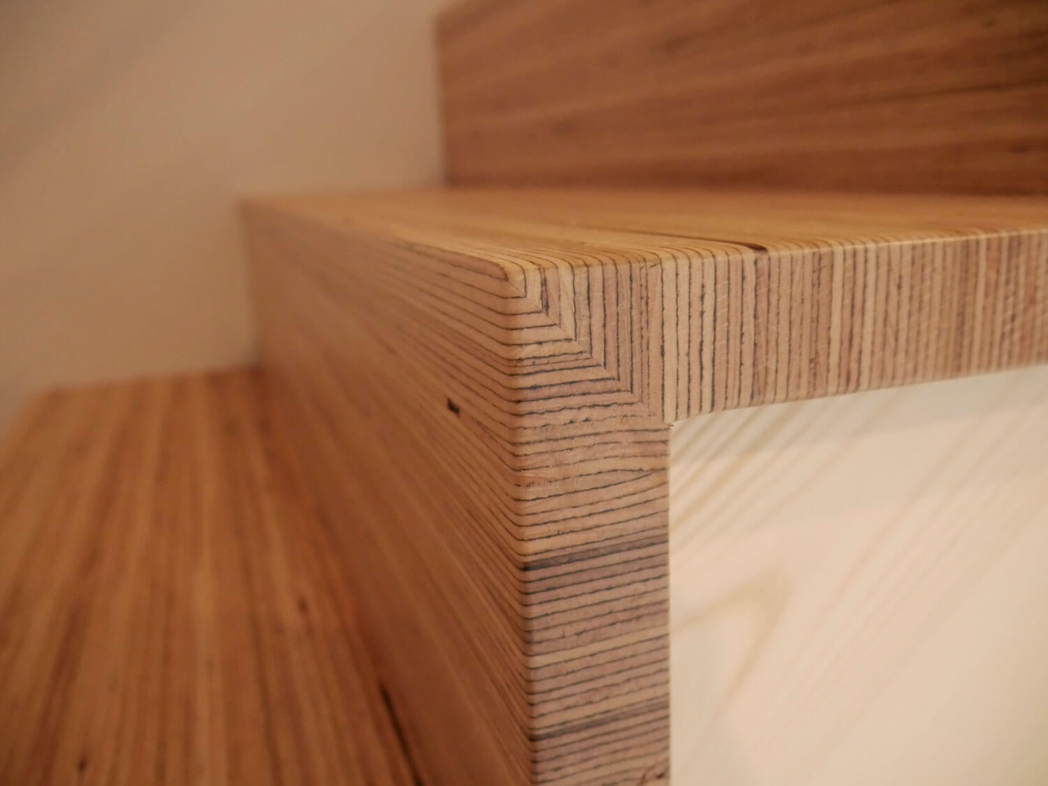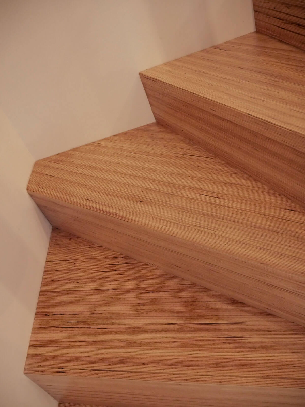 Escalier un quart tournant réalisé en bois « Baubuche », un panneau de hêtre recomposé, offrant une haute résistance mécanique.