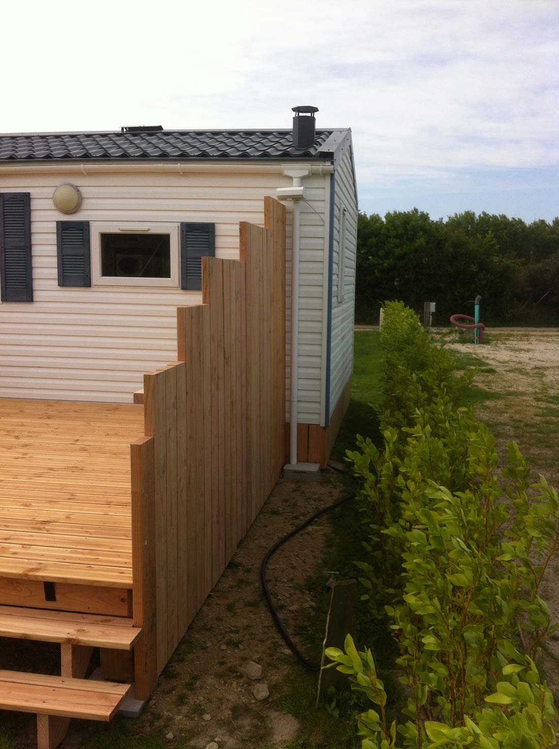 Terrasse de mobil home réalisée en bois douglas, à hauteur de porte, avec :